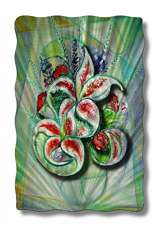 Dramatically transform your lifeless decor with ?Bountiful Bouquet?a dynamic arousing metal wall hanging. This vivacious metal art piece offers a subtle mix of green, blues, and red. Consisting of two metal layers which adds a breathtaking three dimensional effect. The foreground layer offers a swirling set of flowers in the center. The background layer features a hand sanded diaganol finish bringing shimmering intricate presence when light reflects from this artwork